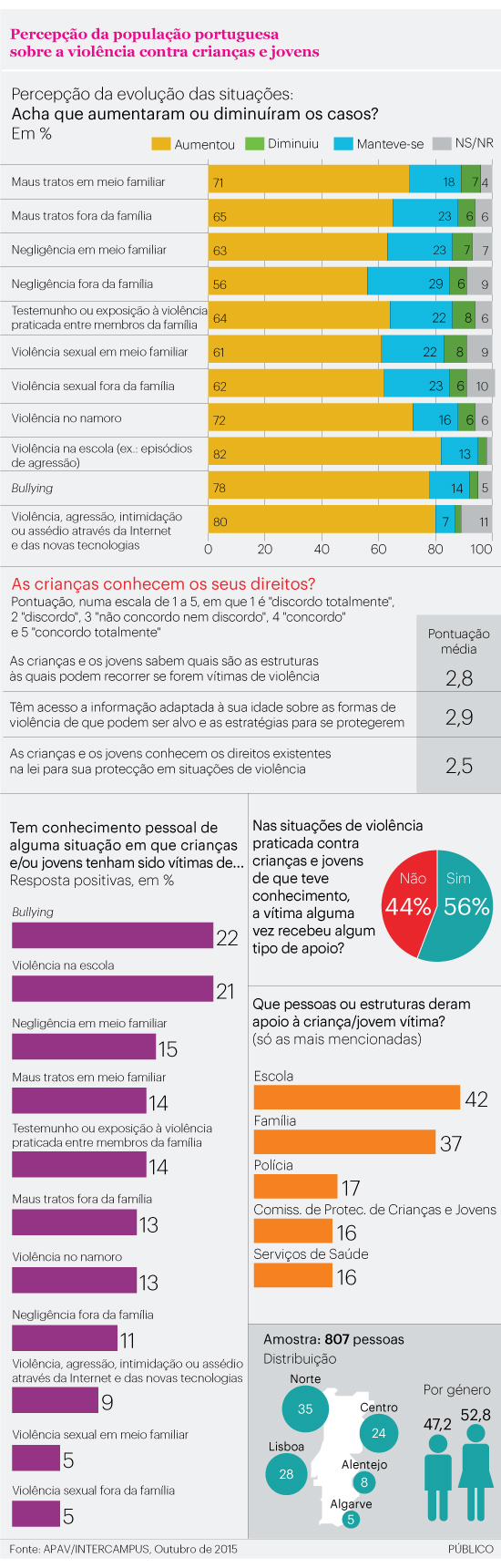 Alguns “casos mediáticos”, prossegue Maria de Oliveira, bem como o “aumento de noticiário e de canais regionais que abordam estes temas”, têm contribuído para que as pessoas estejam mais sensibilizadas — e, eventualmente, para que tenham também a percepção de que há mais situações. Cerca de 80% acreditam que está a crescer o número de casos de violência em contexto escolar, de bullying e de situações de agressão, intimidação e assédio associadas ao uso da Internet e de outras tecnologias, envolvendo crianças (ver infografia). Mas falta o resto: denunciar, quando é caso disso.